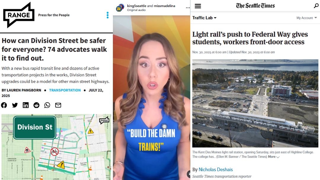 Transportation Choices Coalition successfully elevated our work in local and national media. In total, we were mentioned in the news at least 47 times. Much of the coverage centered around our work in the 2025 legislative session, our Walk & Talk in Spokane, and our advocacy to keep Sound Transit 3 projects moving. We also spoke to the media about why the Federal Way light rail opening is so important for transit riders in South King County.