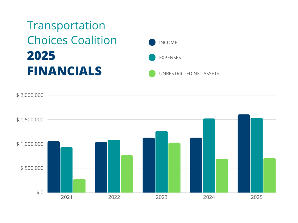 At Transportation Choices Coalition, we know real transportation change takes bold vision — and the staying power to keep showing up year after year. That’s only possible because of supporters like you: individual donors, volunteers, coalition partners, foundation funders, member agencies, and event sponsors who believe Washington can do better. In 2025, we advanced major safety investments, defended transit funding, and organized alongside partners across Washington to win real change. We also continued building long-term support to ensure Washington delivers on the transit expansion voters demanded, including historic milestones like the Crosslake Connection now becoming reality. Progress like this doesn’t happen overnight. It takes sustained advocacy, deep coalition work, and a community that’s willing to invest in what’s possible. This is long-haul work — and it takes long-haul support. If you’re inspired by what you’ve read in this report, please consider making a generous gift today. We can’t do this work without you. Thank you for staying with us for the long haul.