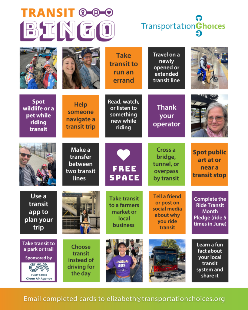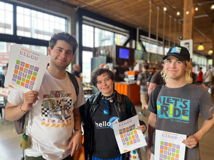 Transit Trivia nights brought riders together in both Tacoma and Bellingham, while regional Bingo challenges from Thurston Regional Planning Council and Link Transit kept the fun going throughout June. Valley Transit’s Mobility University in Walla Walla offered games, skills training, and pizza, and Commute Seattle hosted a webinar to help riders feel confident navigating transit. Sustainability Ambassadors created a helpful bike to bus video to support multimodal travel. ORCA and Washington State Ferries invited the public to help choose new card designs, and SDOT’s Sal the Salmon even made an appearance to help Flip Our Trip get ready for summer. We loved seeing the creativity and enthusiasm from every corner of Washington!