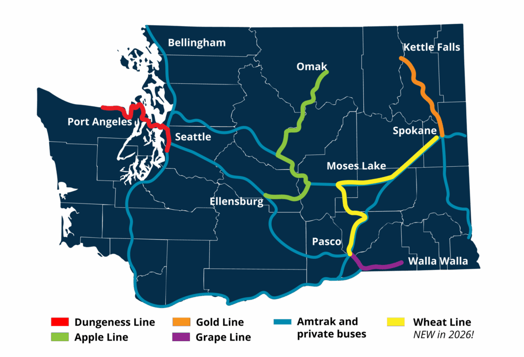 - Increased frequent service on two of the state’s most heavily used routes: the Dungeness Line (Port Angeles to Seattle) and Apple Line (Omak to Ellensburg) each have an additional round-trip per day.
