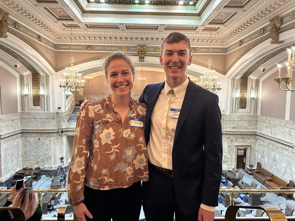 On Thursday, TCC’s Education and Engagement Manager, Iz Berrang, and Advocacy Manager, Holden Ringer, went to Olympia as part of a lobby day for transportation demand management programs and commute trip reduction. These are policies that require and encourage large employers to reduce single-occupancy vehicle commuting by supporting transit, carpooling, active transportation, and flexible work arrangements. House Bill 2307 would update Washington’s Commute Trip Reduction law, expanding the commute hours allowed under the law to support more low-income and shift workers. Iz and Holden met with Representative Joe Fitzgibbon and Senator Bob Hasegawa to share information about transportation demand management programs in Washington, why funding these programs is important, and to discuss the important changes HB 2307 proposes.