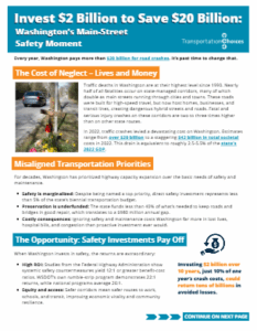Every year, Washington loses billions of dollars, and far too many lives, to preventable crashes on our streets. A modest, strategic investment can reverse this trend, saving lives while strengthening the backbone of local economies and building thriving communities. It is time to shift from more lanes to safer lanes, and from paying endlessly for crashes to investing in people, places, and opportunity.